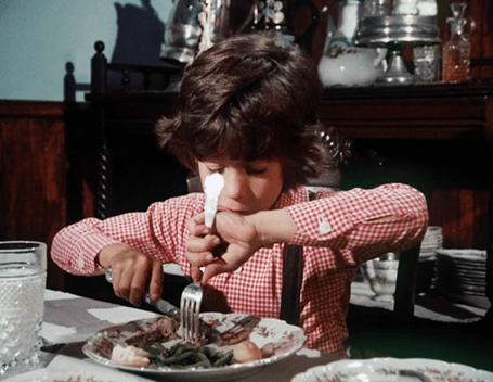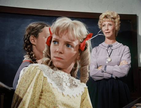 Laura lags behind, annoying Mary, to stare at a sort of ventriloquist’s dummy-looking kid we’ve never seen before. Said kid comes out with Miss Beadle in the midst of discussing a science project.