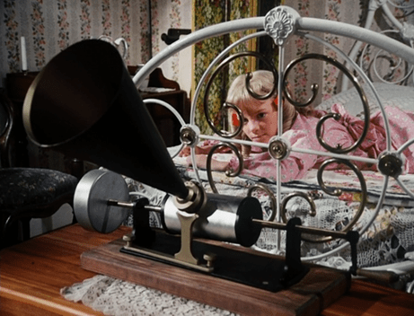 We start with a close-up of that amazing Nineteenth-Century invention, the phonograph. This one is playing sentimental music from a cylinder whilst somebody operates it with a hand crank.