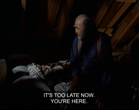 Rolling Carrie in a blanket like a spider wraps a fly, the family rushes into the darkness.