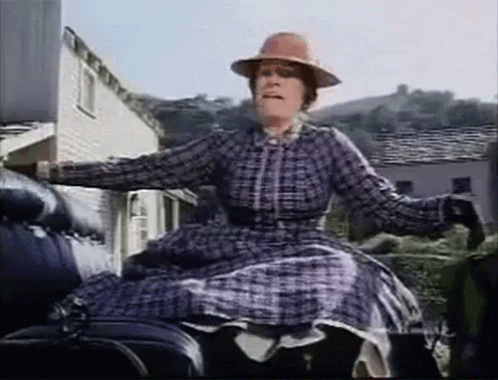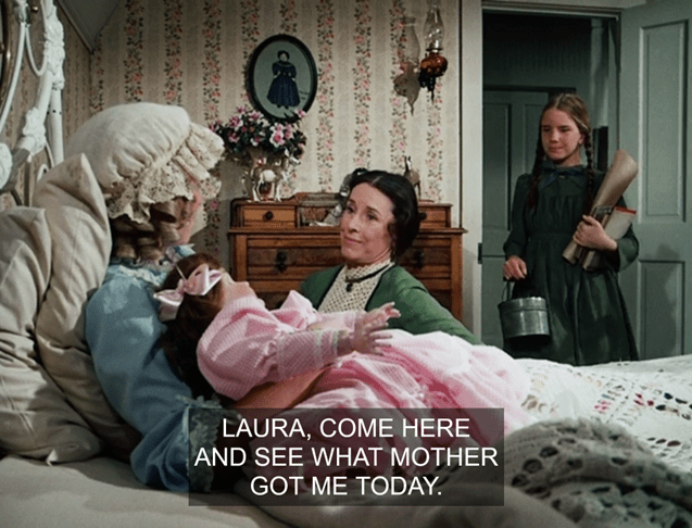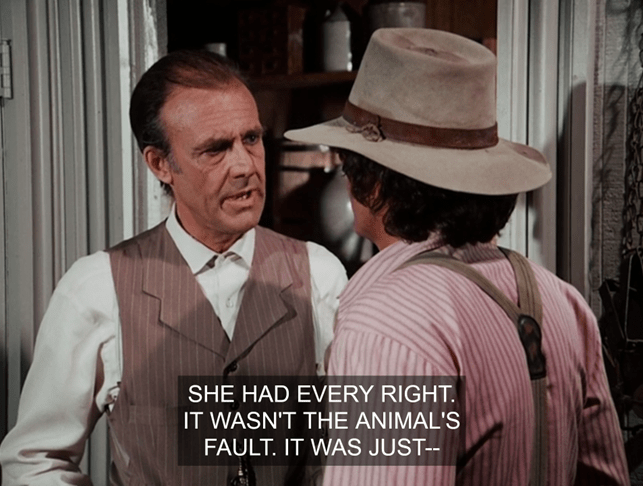 Spotting them, Mrs. Oleson hollers, “Laura Ingalls, what have you done with that filthy animal!”