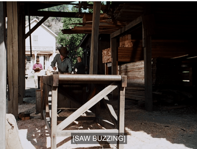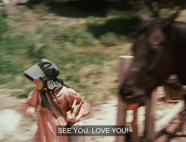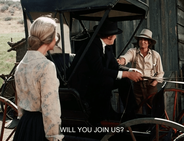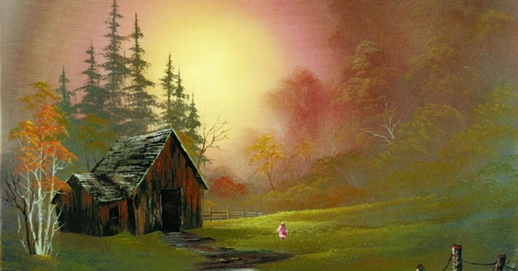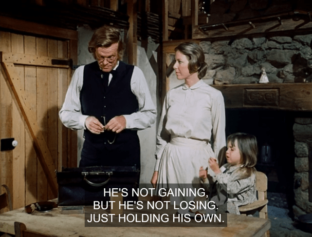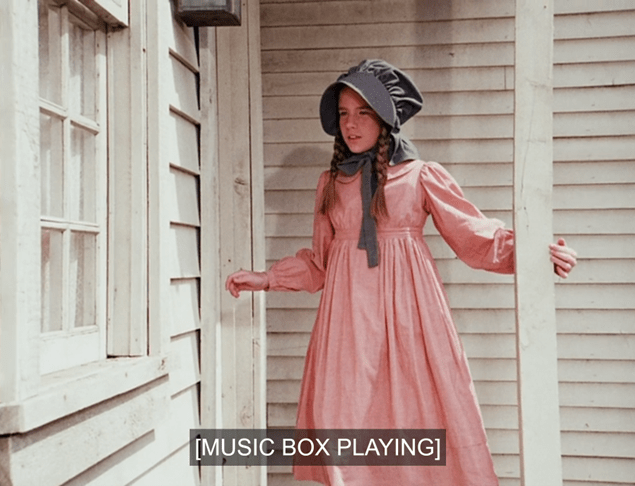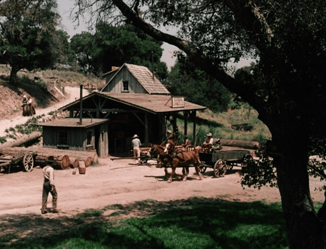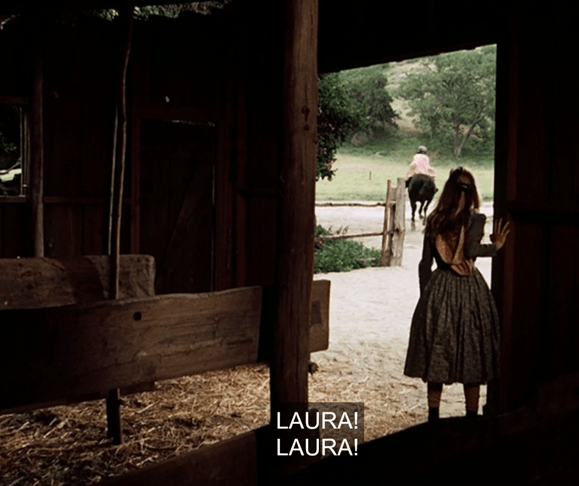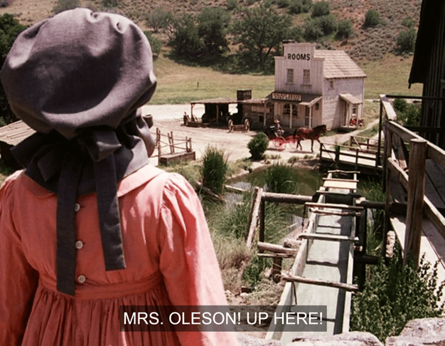 Laura turns, and the Bob Ross landscape is revealed to be just off the Walnut Grove thoroughfare. Presumably an overflow lot for Hans “Rubberface” Dorfler’s livery, or something.