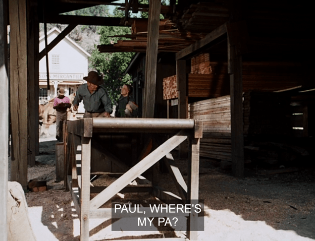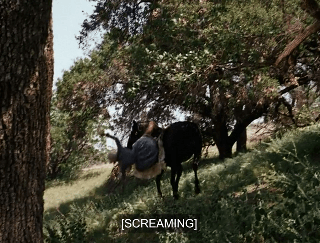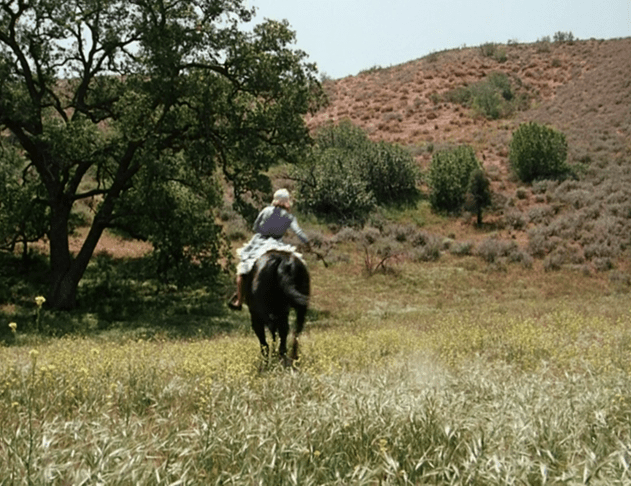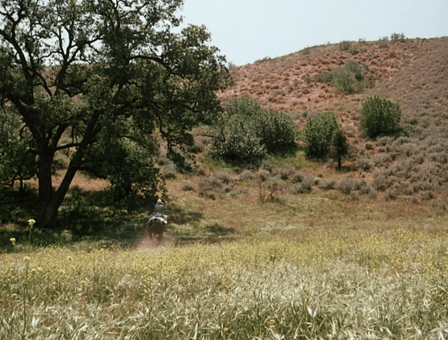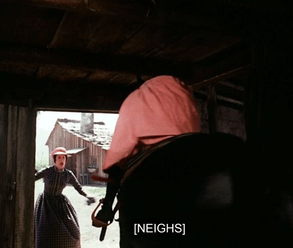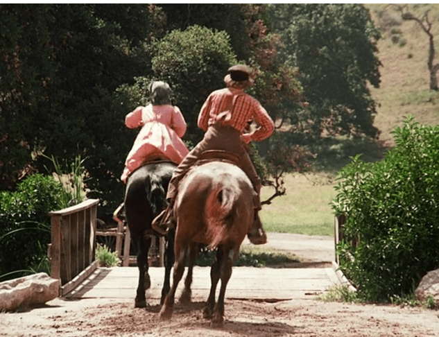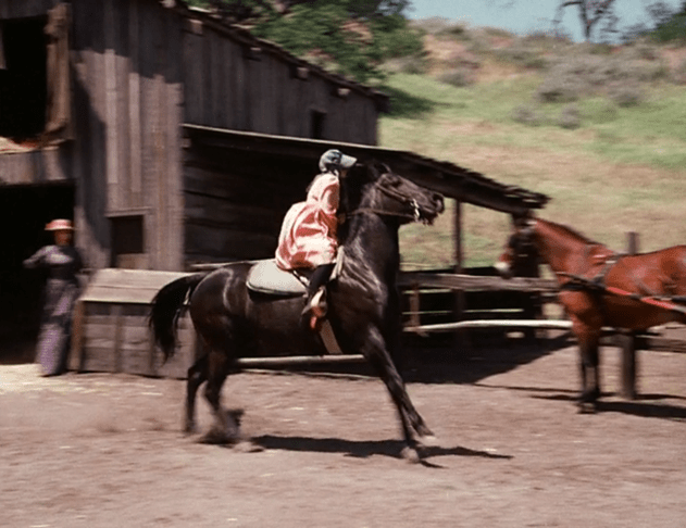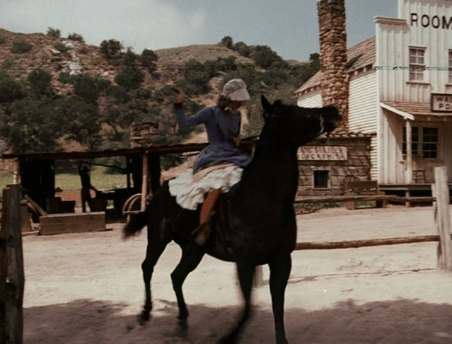 They race into town. The new animal actor playing Bunny, incidentally, is a male horse named “Ott.” Ott was apparently a minor Hollywood star, also appearing on Bonanza and Lassie as well as in Escape to Witch Mountain.