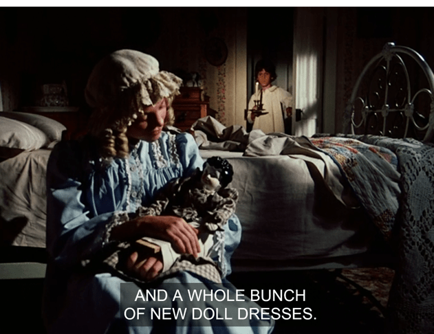She peeps through the window and sees Nellie up on her feet and dancing with the new ugly scary English doll.