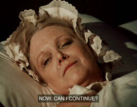 Lansford has gone to the fire to make some beef tea or something when Grandma Ingalls says his name again. (Irritatingly, the fool of a subtitle transcriptionist calls the character “Mrs. Colby.”)