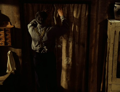 To slightly sad music from the Rose, the man goes inside. He walks to the wall and pulls a curtain back. Weirdly, rather than the expected window, we find it conceals a bedroom, with a woman asleep in the bed.