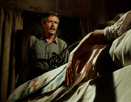Charles physically drags his father through the fire and out the door. Landon’s still doing the stunt work himself, I think, but you can tell from “Lansford’s” wig it isn’t Arthur Hill.