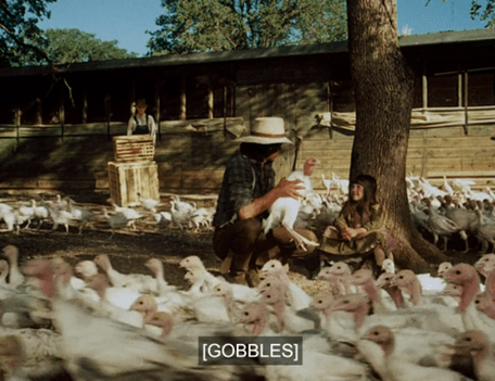 Next, a jarring transition plops us into a screaming field of turkeys.
