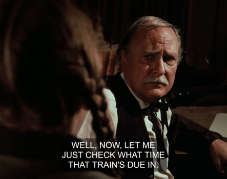 She interrupts the Ticket Guy in the midst of sending a telegram, which seems like a bad idea. But he doesn’t mind. He was probably just sextegramming with somebody halfway across the country, anyways.