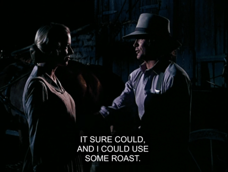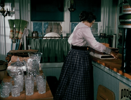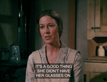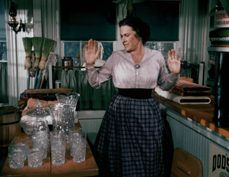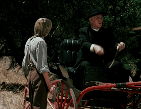 Mrs. Oleson starts to growl at the men for eating produce without paying, but when they say they’ll buy a bushel of the “pears,” she assumes they’re rich and changes her tune.