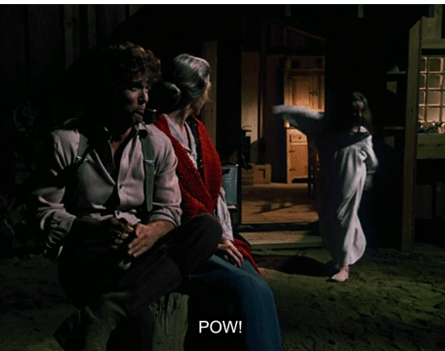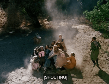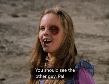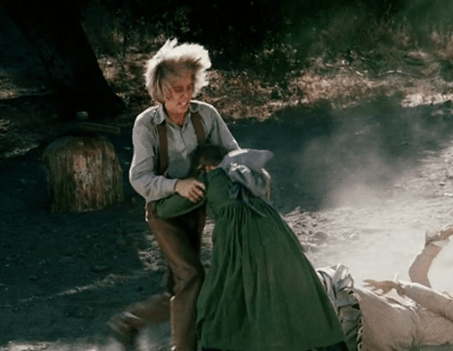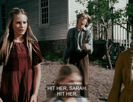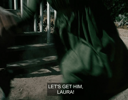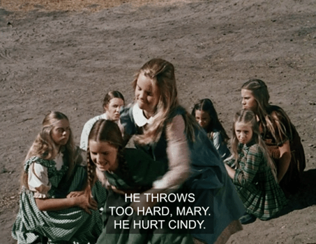 Mary and Laura turn to each other and smile. Then Mary happily cries, “Let’s get him, Laura!” and they join in the beating.