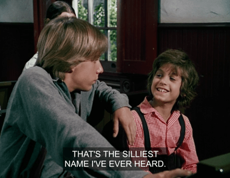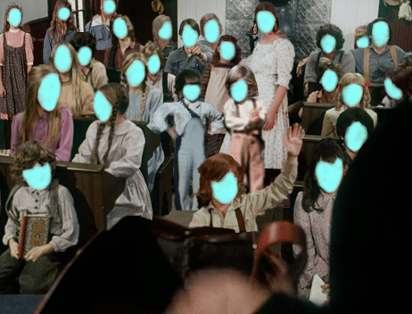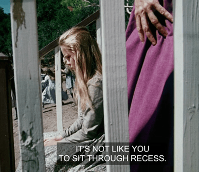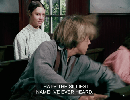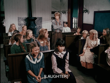 The schoolchildren, who this week include Not-Joni Mitchell, two veteran Nondescript Helens and two newer ones (at least!), Sweet Colleen, Ol’ Four Eyes (excuse me, I mean Mary), Laura, Not-Linda Hunt, Cloud City Princess Leia, Willie, the Midsommar Kid and Nellie, all laugh that their new classmate’s given name is “Bubba.”