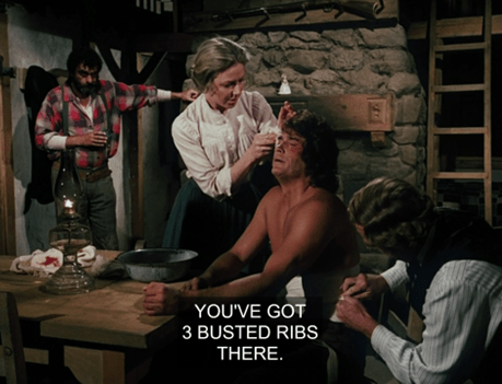 Pa is filling his pipe. He’s got some faint bruising on his face, but certainly doesn’t look like he’s recovering from a severe beating.