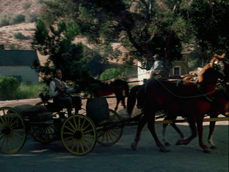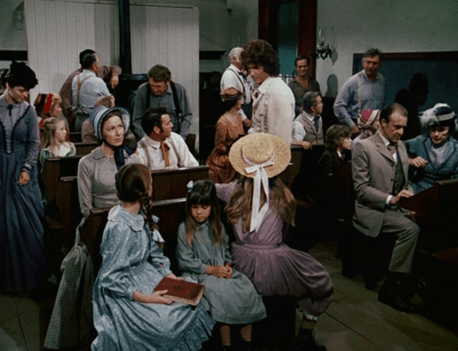 We cut to the Ingallses coming up the thoroughfare in the wagon. They’re dressed for church.