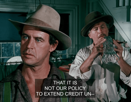 And speaking of paying, Sam G repeats his line of bull about the overdue bank draft, though this time he adds that they spent all their ready cash at the Mercantile.