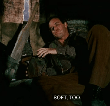 Then he walks over to a barrel, but it’s to wash his face, not to urinate in it, thank God.