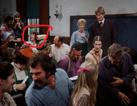 A bunch of late-comers rush past the Mercantile, where Mrs. Oleson is sweeping the porch in a comical maid or washerwoman’s hat.
