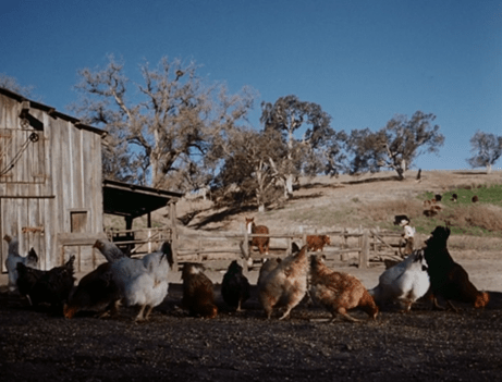 The camera pulls back from some weeds to give us a nicely composed shot of Laura and Mary walking past the Mill.