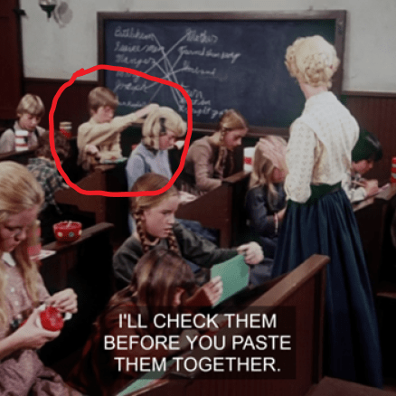 Everyone in town seems to be at the school for the play. Well, I should say, in order of appearance, Caroline, Carrie, Charles, the Non-Binary Kid, the Bead, Johnny Cash Fusspot, Mrs. Foster, the Smallest Nondescript Helen of Them All, Alicia, Mr. Edwards, Mr. Nelson the Gray-Haired Dude, Not-Quincy, Nondescript Helen, Mrs. Oleson, Nels, the Midsommar Kid, Mustache Man (accompanied by another hot filly, who upon close analysis I think may be Not-Quincy Fusspot’s Rather Beautiful Mother from “The Bully Boys”), Carl the Flunky, Sweet Colleen, two AEKs, and a guy who’s either the Generic-Looking Bald Man or Tom Carter (I’ll give each half a point in my scoring system) are there.