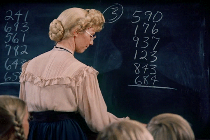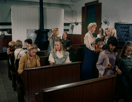 CHARLOTTE STEWART: But you know, I just dealt with it, and I tried to do blackboards that had different lessons on them. Some for children – you know, two plus two is four – some for the older children, which would be history and geography. And when I came onto the set the first time it was ALL “two plus two is four.” So I asked specifically to the prop people if I could do my own blackboards. So all of the blackboards you see on the show are in my handwriting. I did them all, whether it was a geography lesson or history lesson or arithmetic. It’s all my handwriting, on all six blackboards.