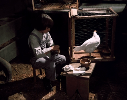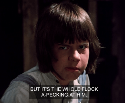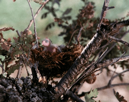 Unlike Lennie from Of Mice and Men, this kid manages to get the bird back into the nest without killing it. And sure enough, the parent bird does actually sit on the baby immediately. Who bred and trained these birds, I wonder? No finch wrangler is listed in the credits.