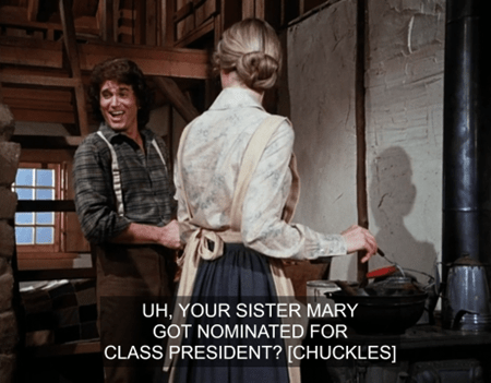 I always wondered what happens to these one-shot characters who overcome scrutiny, isolation and bullying and become accepted by the community, only to never be seen again. My guess is that they remain invisible/unseen before quietly moving from WG. Dr. Ledoux? Was mentioned once after the episode where he was convinced to stay, and never again, probably left onscreen. Spotted Eagle? Maybe his grandfather decided they’d be better off somewhere else. Olga? She’s probably among some of those pigtailed unnamed girls before her family moves away.