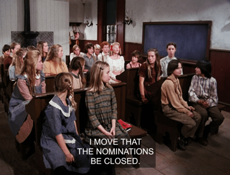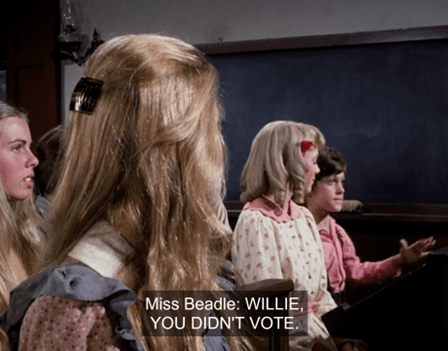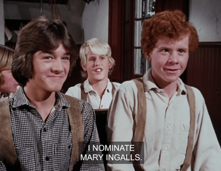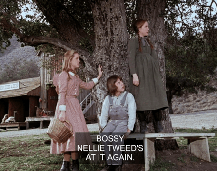 Later, at recess (weren’t they just at recess?), the two bullies are scheming to rig the election against the girls – specifically Nellie, whose ambition is well-known to everyone, both watching this show and trapped inside it.