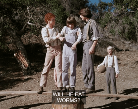 Anyways, the two other boys, who we could already tell are sickos, trick Elmer into nearly eating the worm.