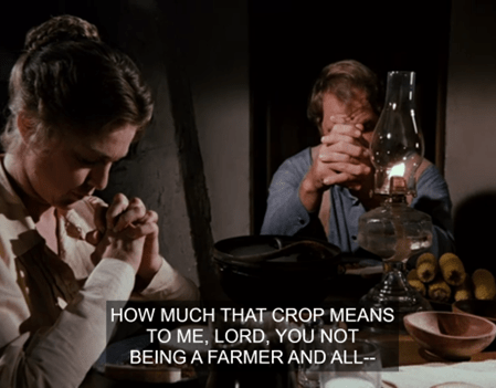 Garvey’s speech is a simple one – Jonathan apologizes for his lack of eloquence, then thanks God for his wonderful family and a good harvest. He starts digressing about how much or little God knows about farming, but Alice Garvey gets him back on track.