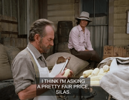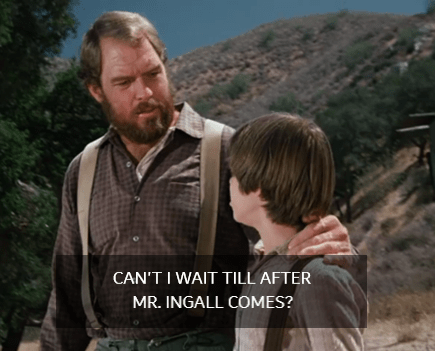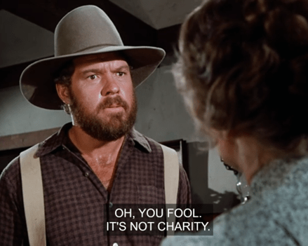 (The Mill’s operations, as always, are opaque. Why wouldn’t there be work available? It’s the harvest season, by all accounts a hugely successful one. Surely there’d be feed to deliver, flour to grind, etc. Three or four months? Walnut Grove should be a boom town! People would be building and investing based on this bumper crop; why, Garvey himself was about to order a new barn in the opening scene, and just a minute ago Charles was buying out the Mercantile like a poet on payday.)