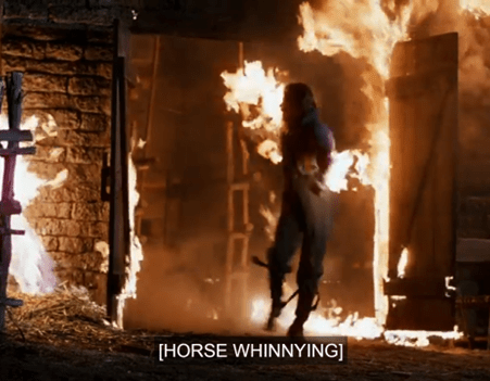 In case you’ve forgotten what show you’re watching, we then get to see Jonathan Garvey, arguably the nicest guy in town (and that’s saying something), with his shirt on fire in several places, screaming and snarling in agony as he gets another horse out.