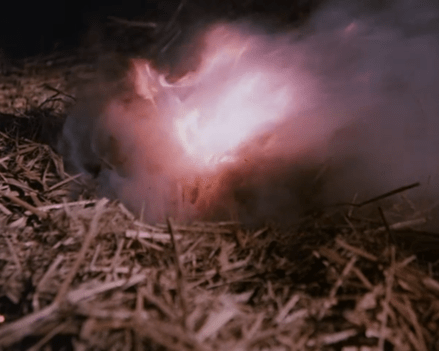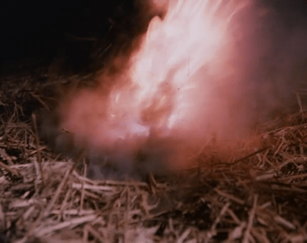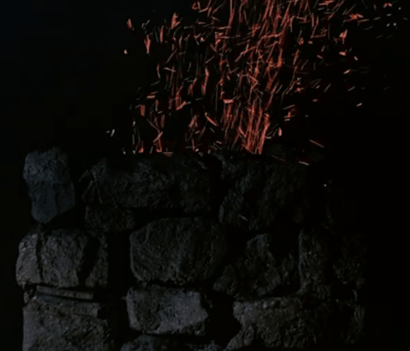 In a nice piece of TV magic, the chimney cinders blow directly onto some hay on the floor of the Barn of Garve, which ignites.