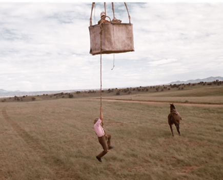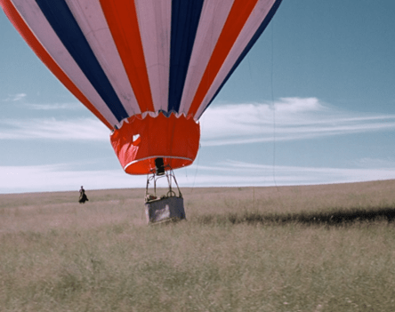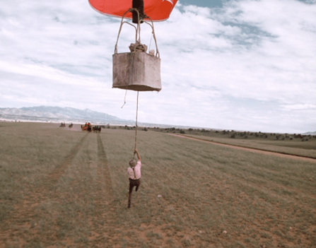 To some excellent if nutty chase music, the balloon blows out into the countryside.