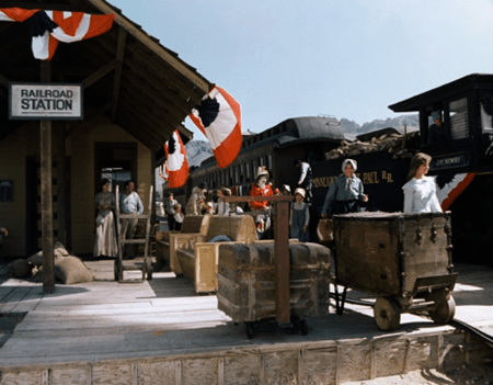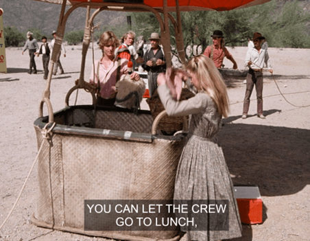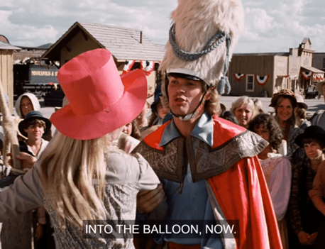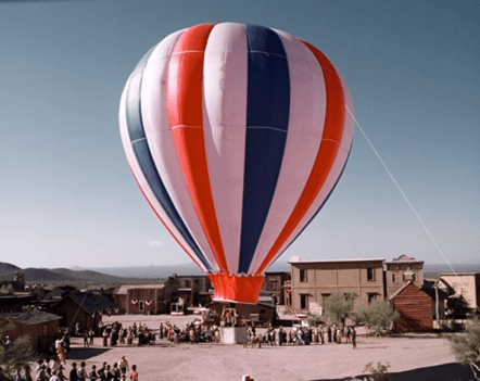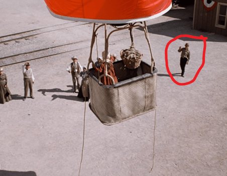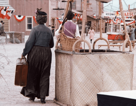 The camera follows the train around the bend, and we see we are in fact in a larger town than Walnut Grove. And in the center of the shot is a hot-air balloon.