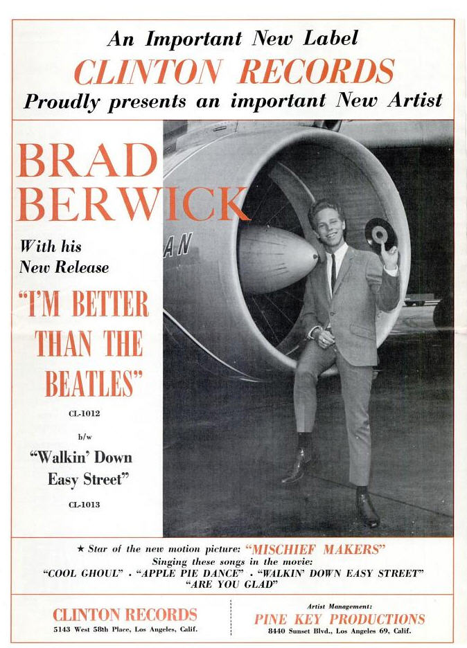 Bradley/Brad David also seems to be the singer behind the rather abominable 1965 diss-track “I’m Better Than the Beatles,” though if his promised star movie vehicle Mischief Makers ever materialized, the internet has no knowledge of it.