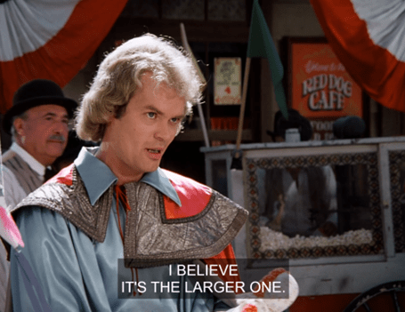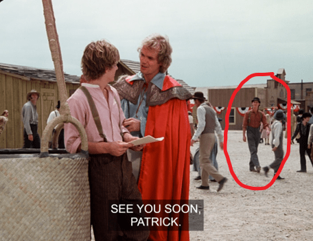 Then, in a jealous rage, Patrick runs out to the balloon and chops it loose with an ax. I don’t understand, why is it still inflated? Wouldn’t the fire need to be fed continuously, so it doesn’t collapse?