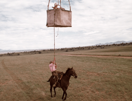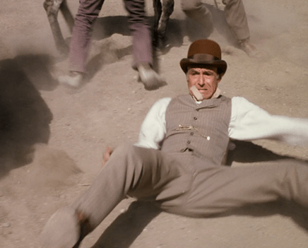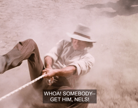 In an excellent shot, then, Patrick catches the rope, but he gets pulled off his horse and dangles from it. I don’t know who the stuntman is, but the likeness is good enough.