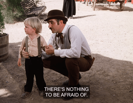We see some sort of mustached gomer talking to a toddler about how rides are nothing to be afraid of.