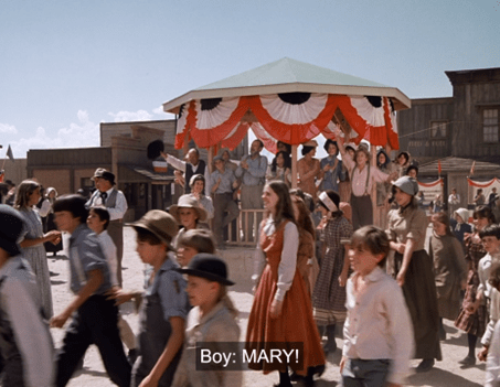 He grabs Mary, who’s put on a paper top hat for some reason, out of the crowd and literally shoves her into the balloon basket.