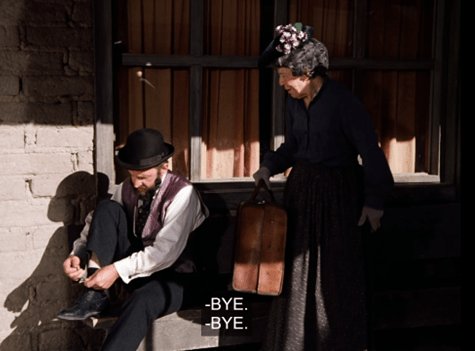This vested pickpocket quickly wanders away, but we notice he’s closely followed by a rather wobbly older lady.