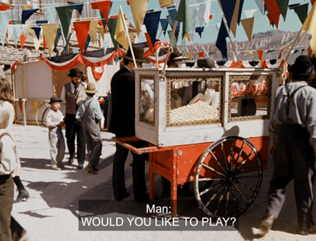 He even orders the barker to give him a better prize, so obviously the game has been rigged in his favor, though I have no idea why it would be. Does he own the whole fair?