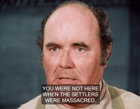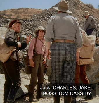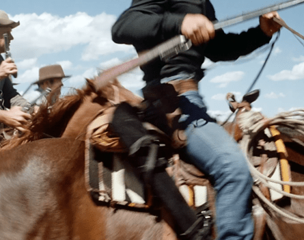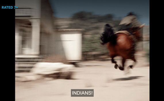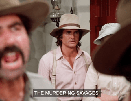 But with the immortal line “Then what in the heck are THEM?”, the kid points up the street, and indeed, we see three Indigenous men riding slowly into town. They’re armed – with traditional weapons, not guns.