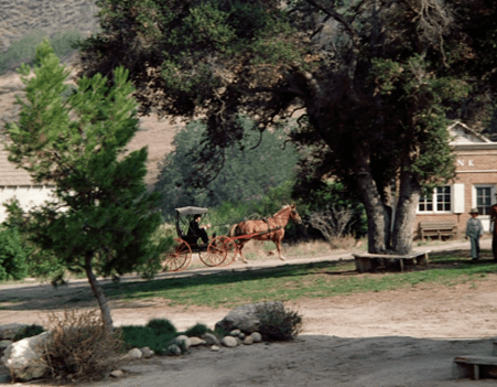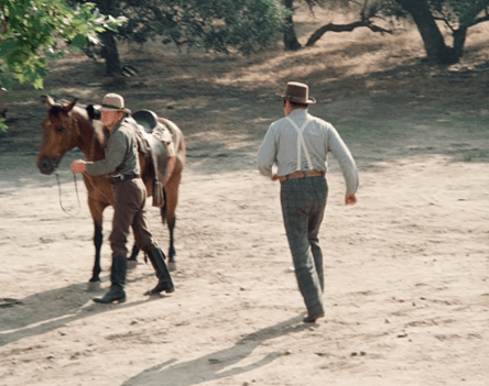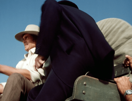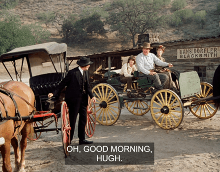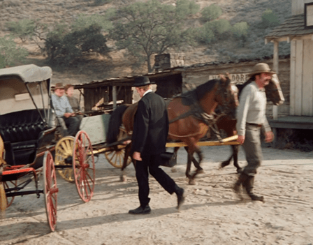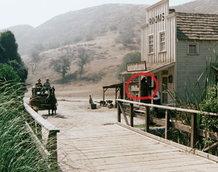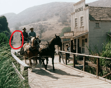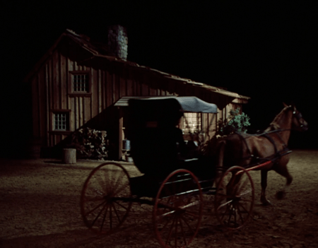 [UPDATE: Boy, did I miss a big one. Reader rosebud92rs notes that as Charles and Doc discuss the situation, you can see a pair of hands shaking the wagon to make it look like it’s moving. This goes on for a good thirty seconds!]