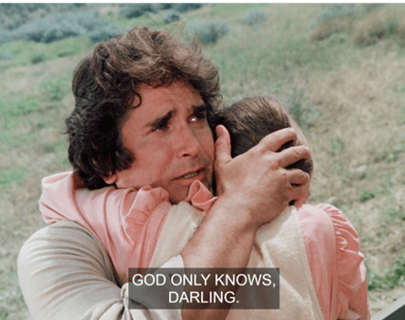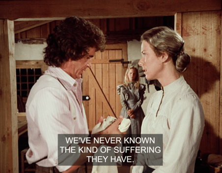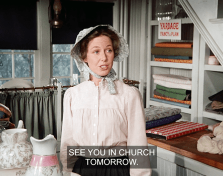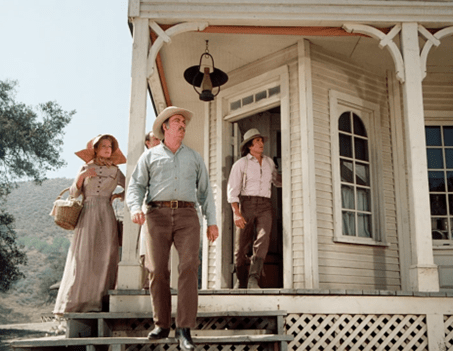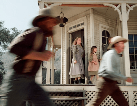 The camera then cuts to a wonderful panoramic shot of all the men of Walnut Grove, who stand silently in front of the church, staring. (What are they all doing in town at once?)