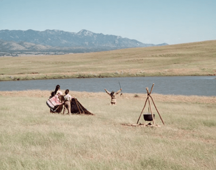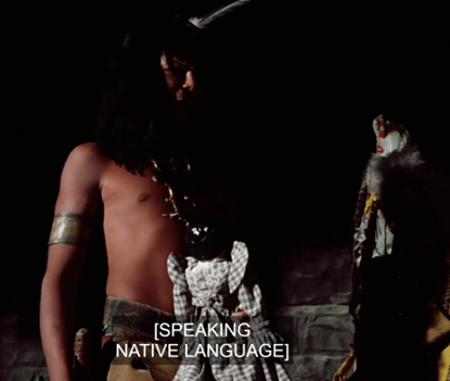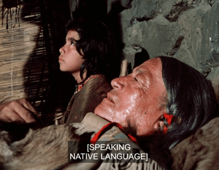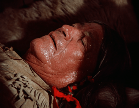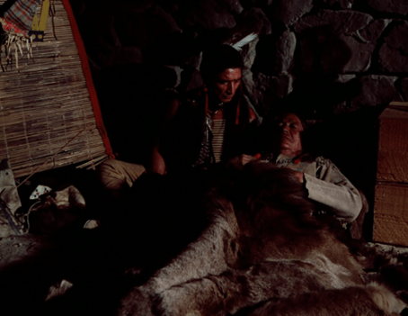 Inside the teepee, we see the chanting is actually coming from (presumably) a medicine man, who’s singing over an old man lying on a bed made from reeds (or something). I don’t know the Dakota language, so I can’t say whether the speech and songs we hear in this one are accurate.