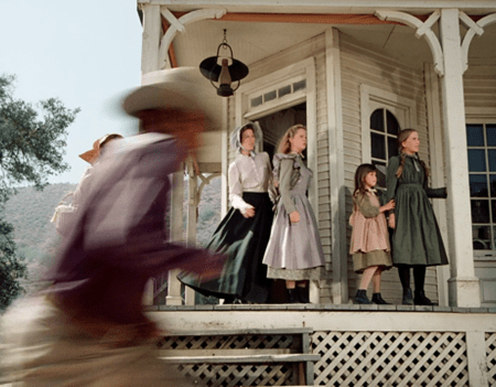 From the porch, the women watch the Indians approach. (Mrs. Oleson has come out too.)