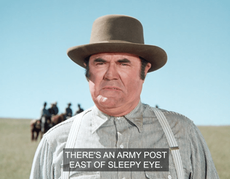 MacGregor says they’ll go . . . only to return with reinforcements from the U.S Army, which he says can be found at a never-before-mentioned “post east of Sleepy Eye.” (I’m not sure what he’s referring to. There were a few Army forts in that general vicinity at one point, but they were all defunct by the late Nineteenth Century.)