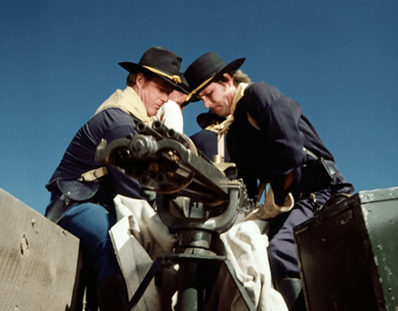 And sure enough, now we see the posse coming back with a wagon full of soldiers and a Gatling gun.