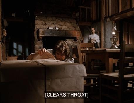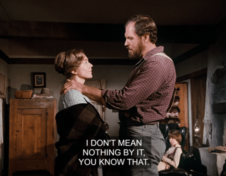 Pa comes in with a bloody hand, having injured it on a piece of equipment. He’s quite cheerful, though, telling Carrie he bit one of his own fingers off. Ha!