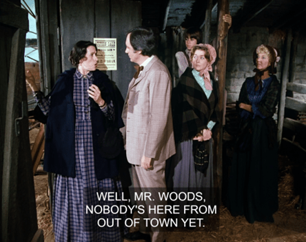 Flash forward a little, and we see Harvey B. Woods, auctioneer, bickering with Mrs. Oleson about whether to start the auction.
