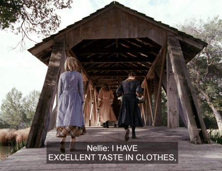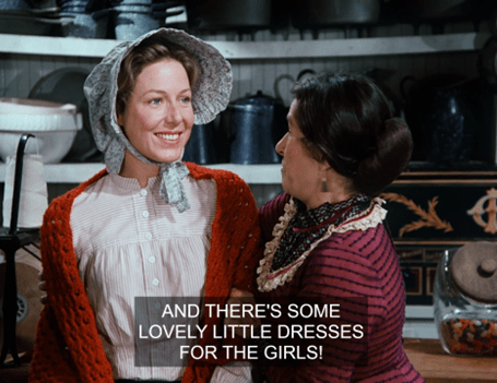 Quick note about the scene with Carrie and Ma and the dress fitting: I think through the dialogue were are meant to understand that Ma is making over (altering) one of Laura’s outgrown dresses for Carrie. Hence Carrie asking if she’ll still be wearing Laura’s old clothes when she is grown. I wore a lot of hand-me-downs growing up, so I get it. Also, I think the dress Carrie is wearing is very similar, if not the same, as the Running Down That Hill opening/ending credits dress. And Melissa Gilbert now has that dress framed in her home, which is too sweet.